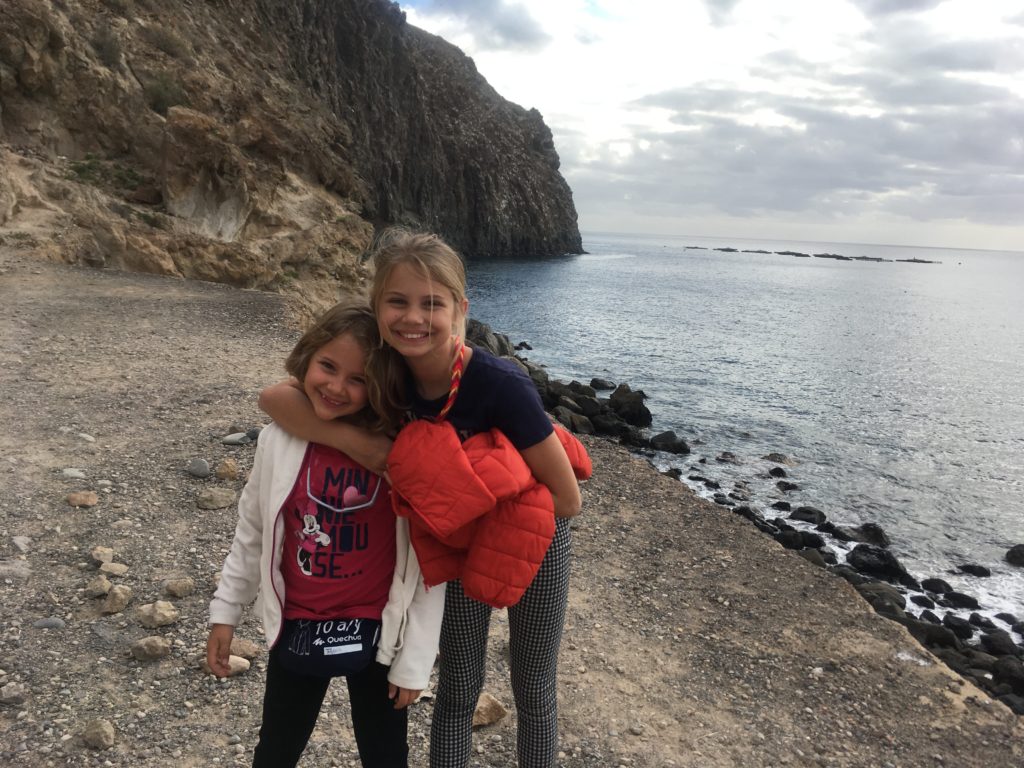 Nous avons aussi continué à travailler tous les matins, et l’après-midi nous étions récompensées par un film au cinéma: jeudi ce fût “la Reine des Neiges II” et vendredi, un documentaire passionnant: “Marche avec les Loups”. Nous avons repris l’avion direct pour Ténérife le samedi 18 janvier pour retrouver notre Grand-Père paternel qui est venu y faire du parapente, et attendre Sofia ramené par papa et Loïc.